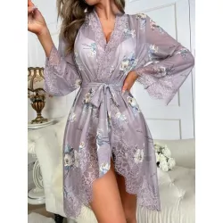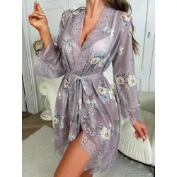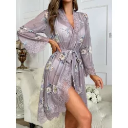 Bata con estampado floral con encaje en contraste con cinturón de malla con cinturón